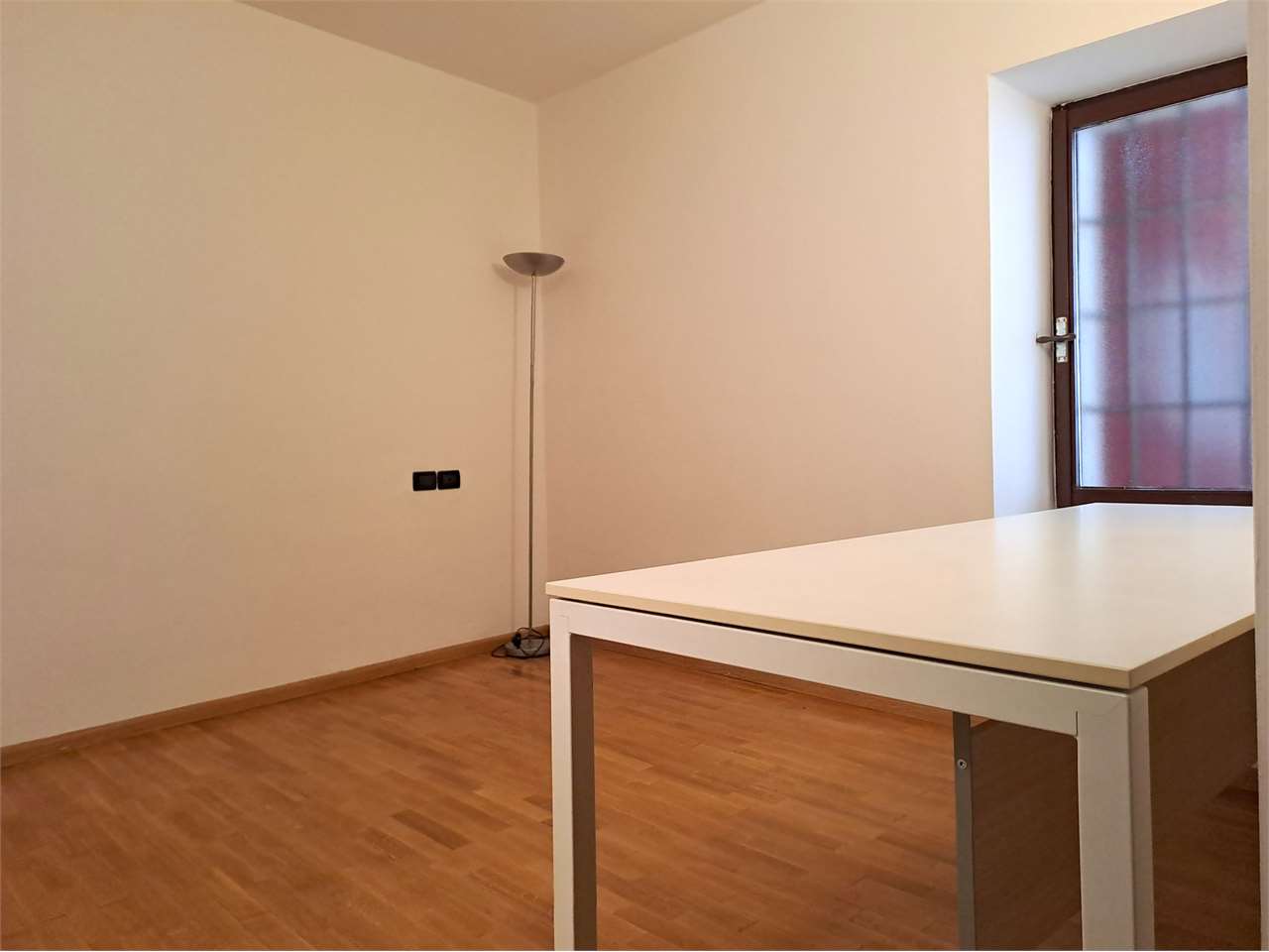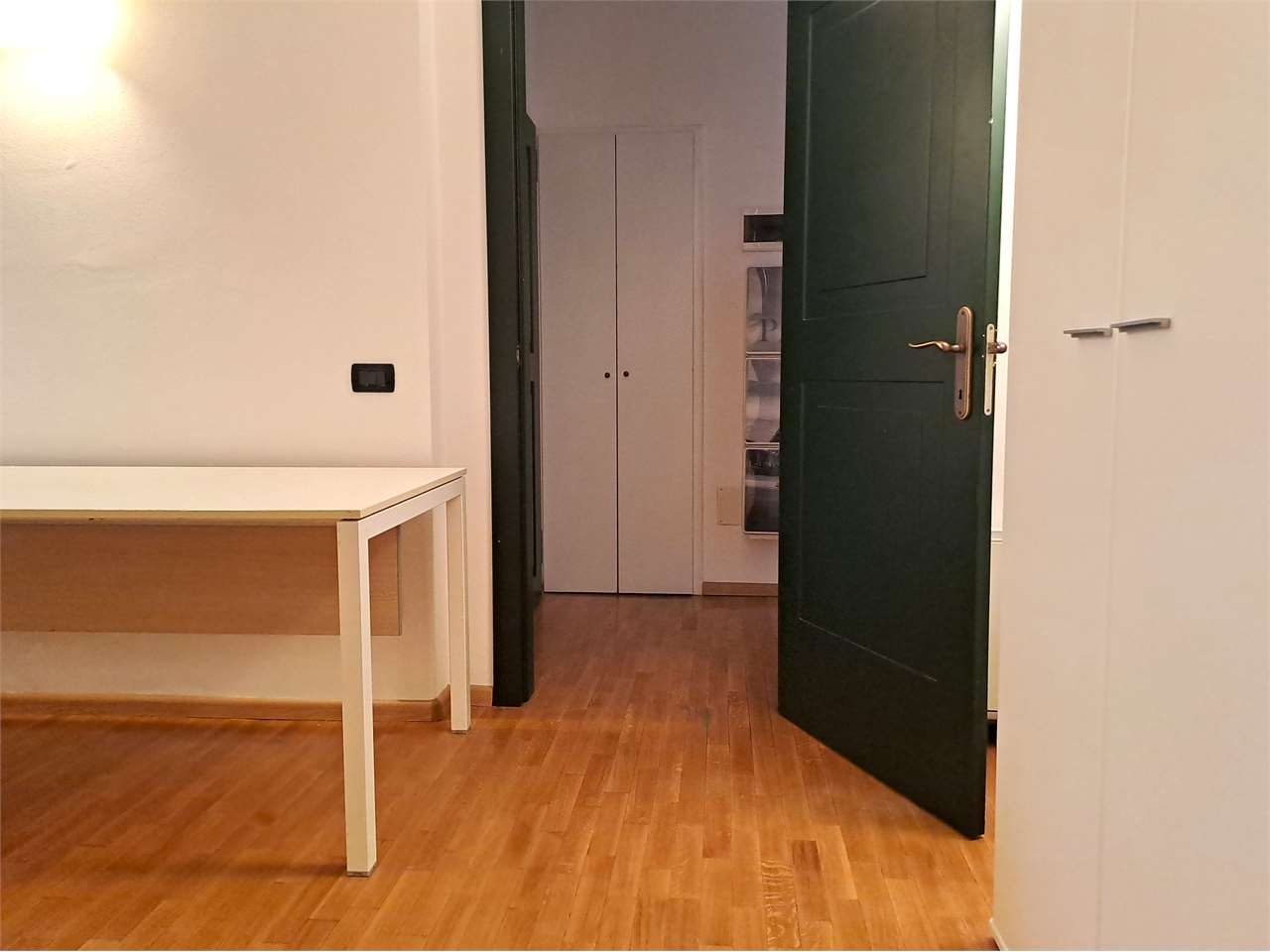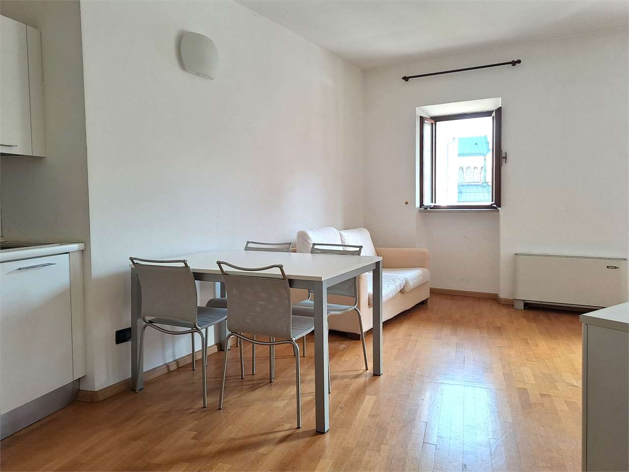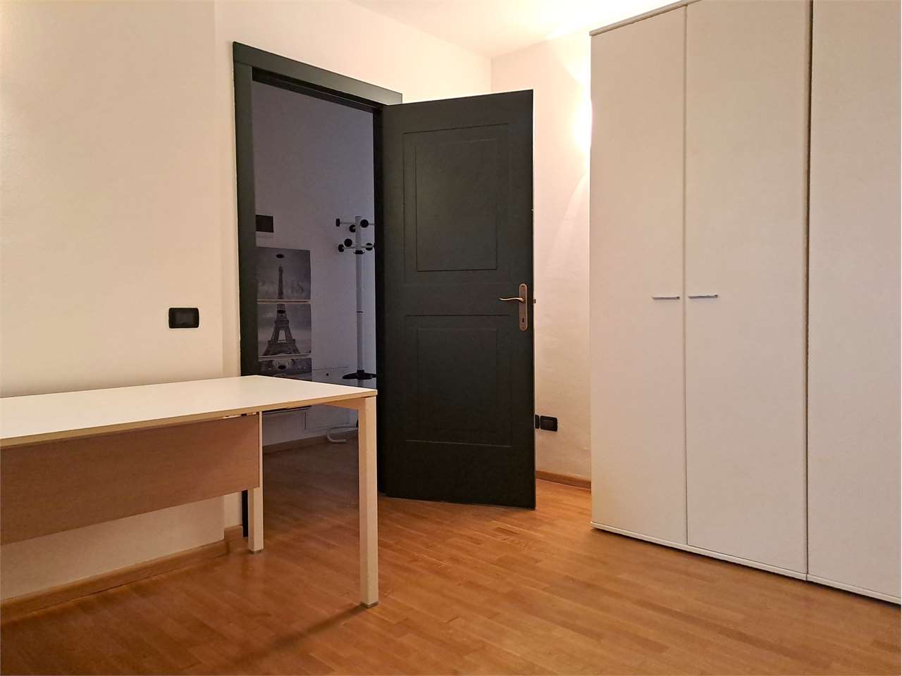 L'appartamento è così composto: ingresso, luminosa zona giorno con angolo cottura, camera matrimoniale, stanza/ufficio, elegante bagno con doccia e lavatrice.
