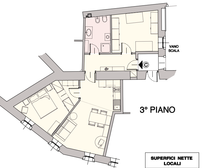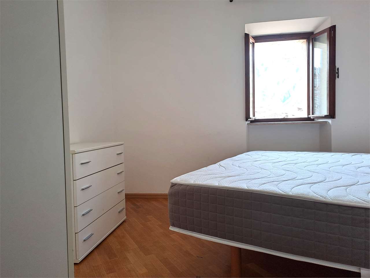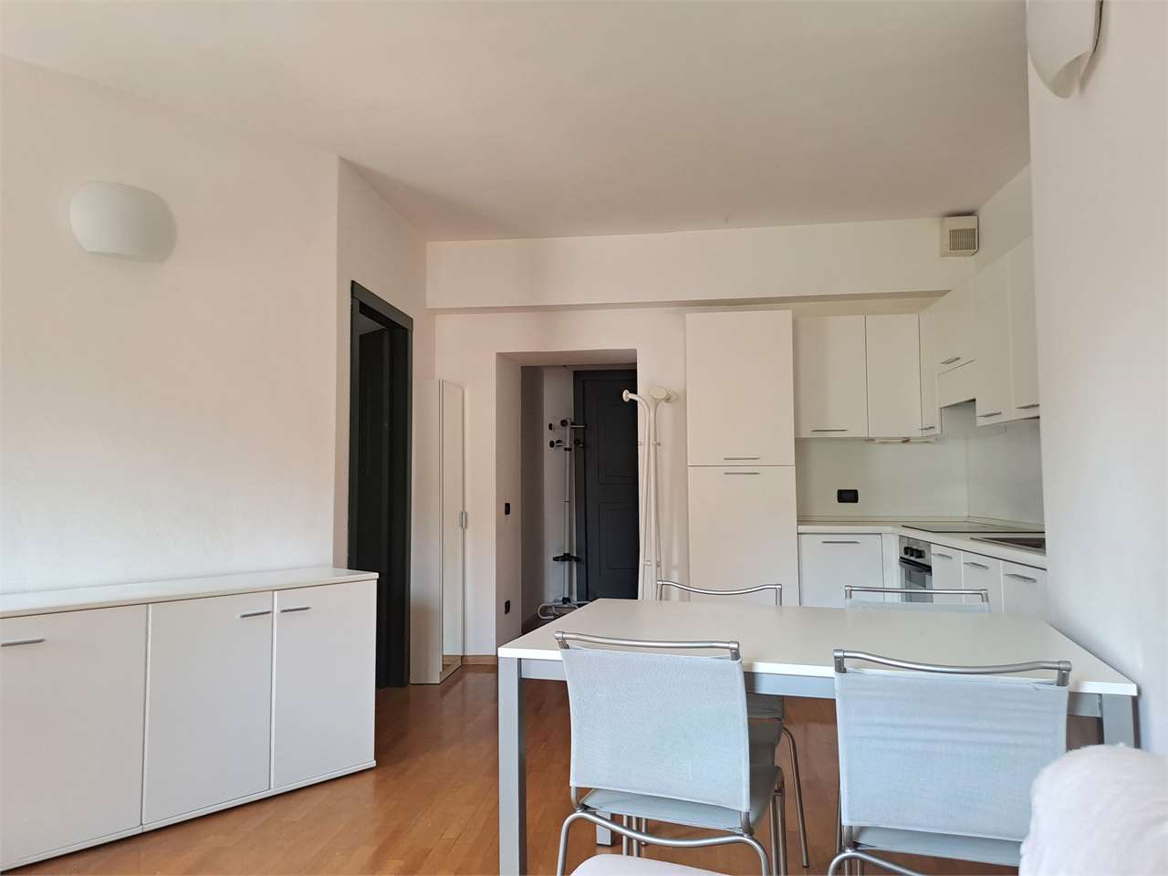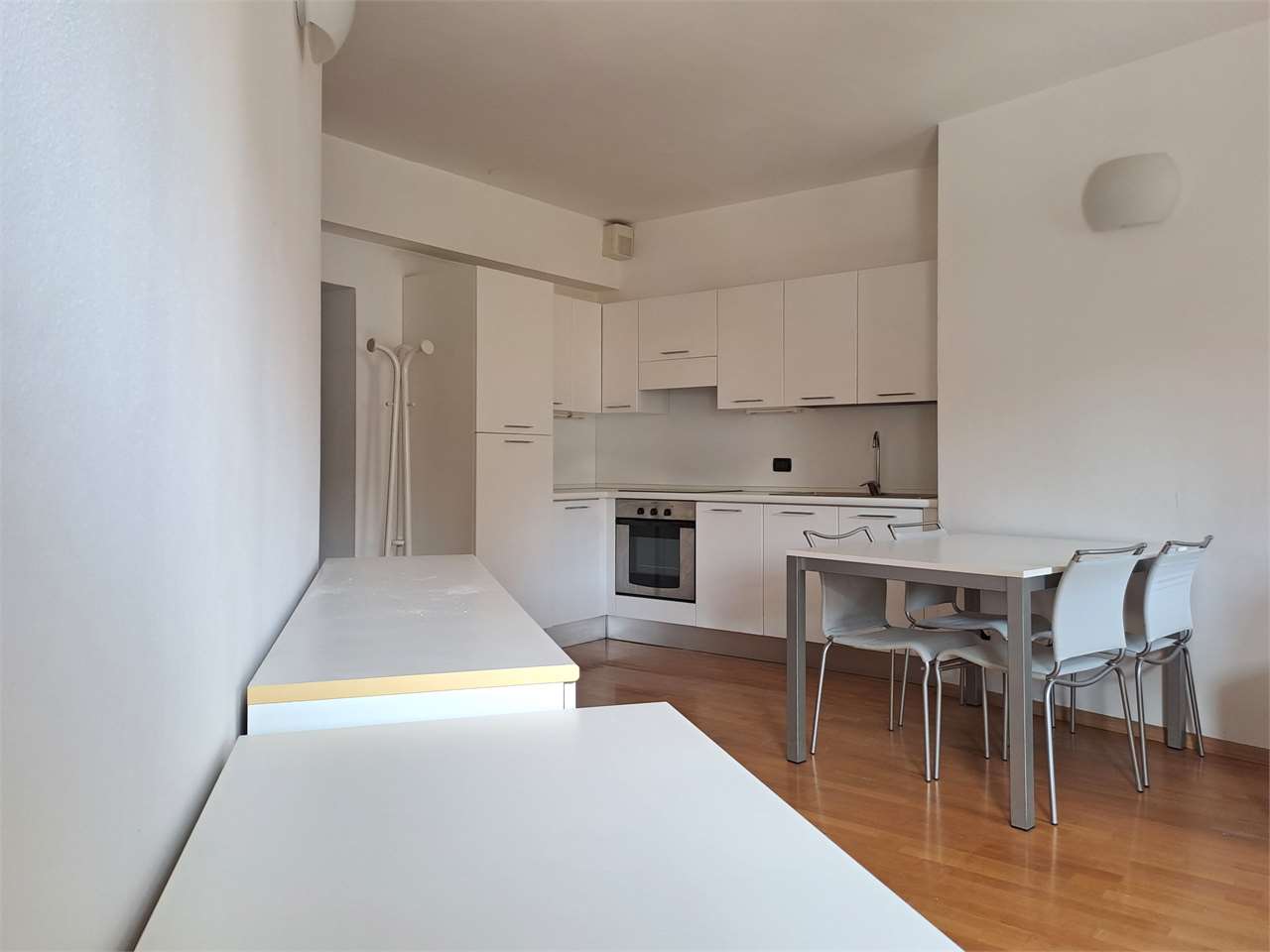 L'appartamento è così composto: ingresso, luminosa zona giorno con angolo cottura, camera matrimoniale, stanza/ufficio, elegante bagno con doccia e lavatrice.
